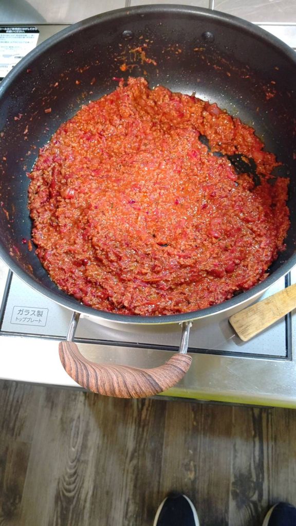 赤はビーツの色。鹿肉が無かったので、牛豚ミンチを使いました。